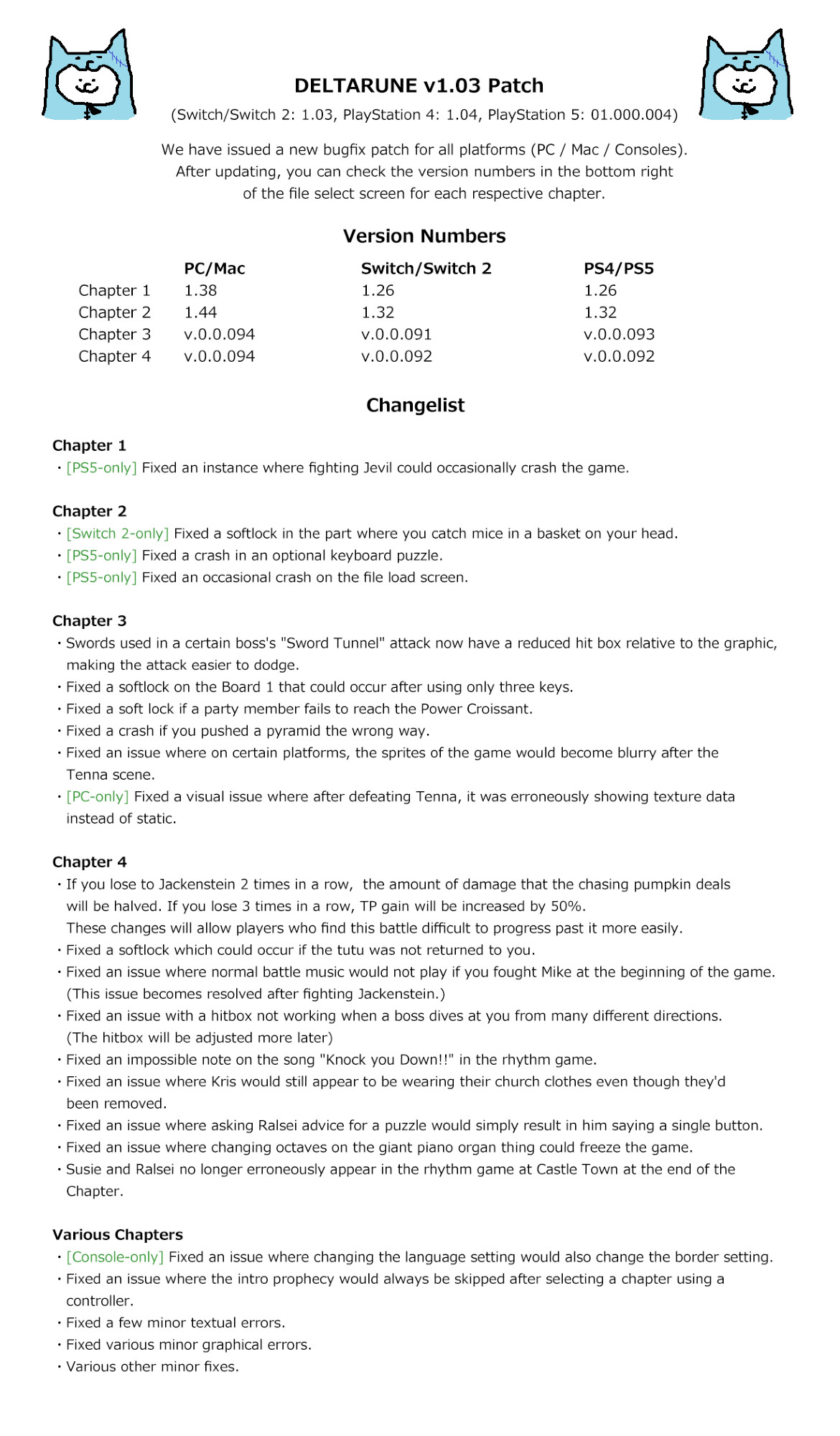 The official/base DELTARUNE version has been updated to PC v1.03, including many bug fixes by Toby Fox! You can view his full list of changes here!